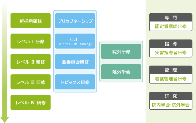 看護実践のモデルになり、指導できることを目標に、看護管理について学びます。また、自分の興味関心に合わせて、トピックス研修や外部研修を受講します。 なお、レベル4研修は自己研鑽・自己学習の支援の意味合いから時間外研修となり、日勤終了後に行われます。